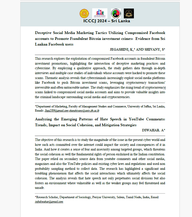 | Citation: | Jegashini, K, And Shivany, S (2024). Deceptive Social Media Marketing Tactics Utilizing Compromised Facebook accounts to Promote Fraudulent Bitcoin investment crimes: Evidence from Sri Lankan Facebook users, First International Conference on Criminology & Criminal Justice NEW HORIZONS IN CRIMINOLOGY AND CRIMINAL JUSTICE University of Sri Jayewardenepura, Sri Lanka October 3 - 4, 2024, Page No 54. |